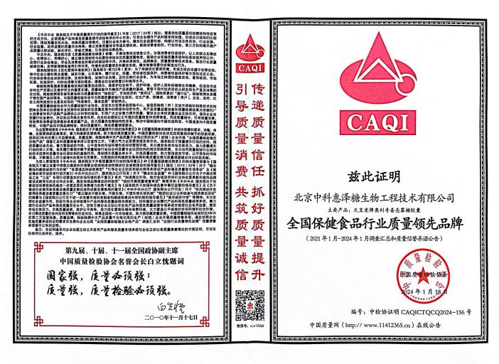 2024年“3·15”主題活動期間,中國質(zhì)量檢驗協(xié)會向北京中科惠澤糖生物工程技術(shù)有限公司頒發(fā)了“全國產(chǎn)品和服務質(zhì)量誠信示范企業(yè)”、“ 全國保健食品行業(yè)質(zhì)量領(lǐng)先品牌”兩項榮譽證書,這是中科惠澤公司連續(xù)13年獲此殊榮。紅彤彤的榮譽證書,是對中科惠澤24年來誠信經(jīng)營,堅持高質(zhì)量發(fā)展,不斷提升廣大消費者信心的高度贊譽和肯定。