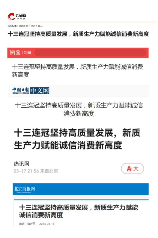 十三連冠堅持高質(zhì)量發(fā)展,新質(zhì)生產(chǎn)力賦能誠信消費新高度