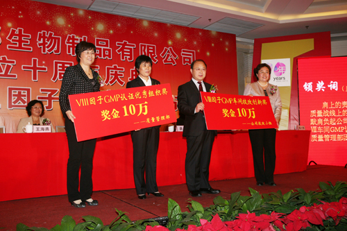 慶典會議在山東省泰安市福朋酒店舉行。本次慶典會議的參會嘉賓有中國輸血協(xié)會朱慶生理事長、衛(wèi)生部醫(yī)政司血液管理處陳斌、泰安市副市長周靜、王海燕副局長、山東衛(wèi)生廳副廳長襲燕、中國食品藥品檢定研究院生物制品檢定所所長沈琦、中國醫(yī)學(xué)科學(xué)院輸血研究所所長鄭忠偉等相關(guān)領(lǐng)導(dǎo),以及各省市醫(yī)療衛(wèi)生部門、各省市血液中心的主任等相關(guān)人員。慶典會議由山東泰邦王岢義副董事長主持,會議開始前,在泰邦生物集團(tuán)高小英董事長的帶領(lǐng)下,參會嘉賓一行來到山東泰邦的辦公樓和廠房參觀,共同鑒證并分享山東泰邦作為民族生物制藥企業(yè)在十年發(fā)展歷程中的進(jìn)取與收獲。明亮的辦公樓大廳墻壁上,一幅幅展示板圖文并茂的向參觀的嘉賓展示了山東泰邦十年發(fā)展歷程中取得的一個又一個驕人成績。